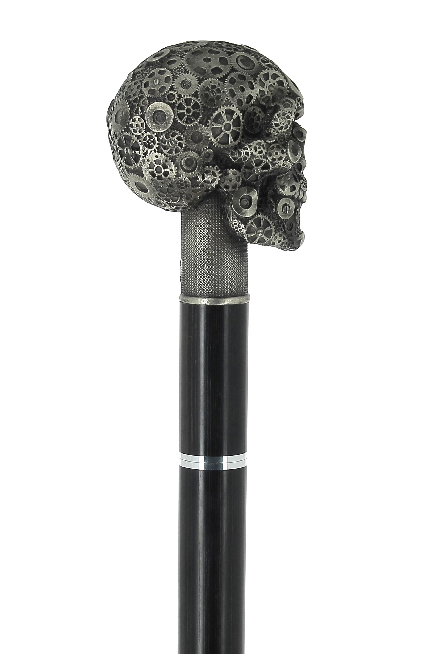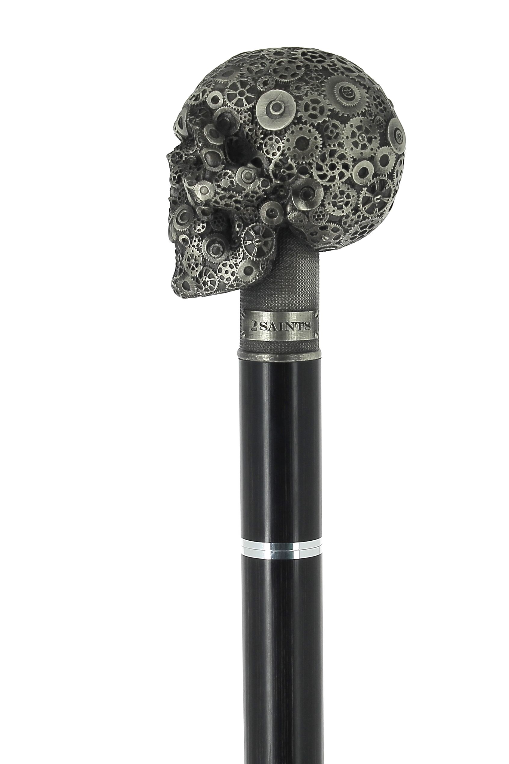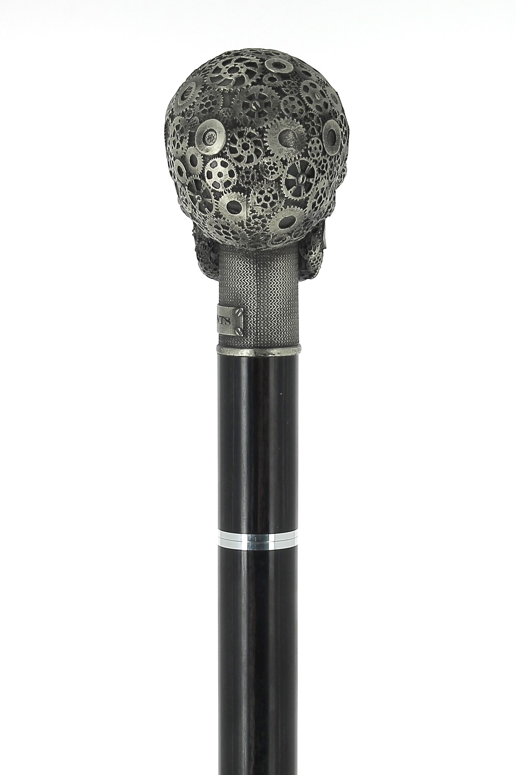Représentant une magnifique tête de mort, le pommeau de la canne est constitué d’engrenages délicatement dessinés et parfaitement assemblés les uns aux autres._x000D_