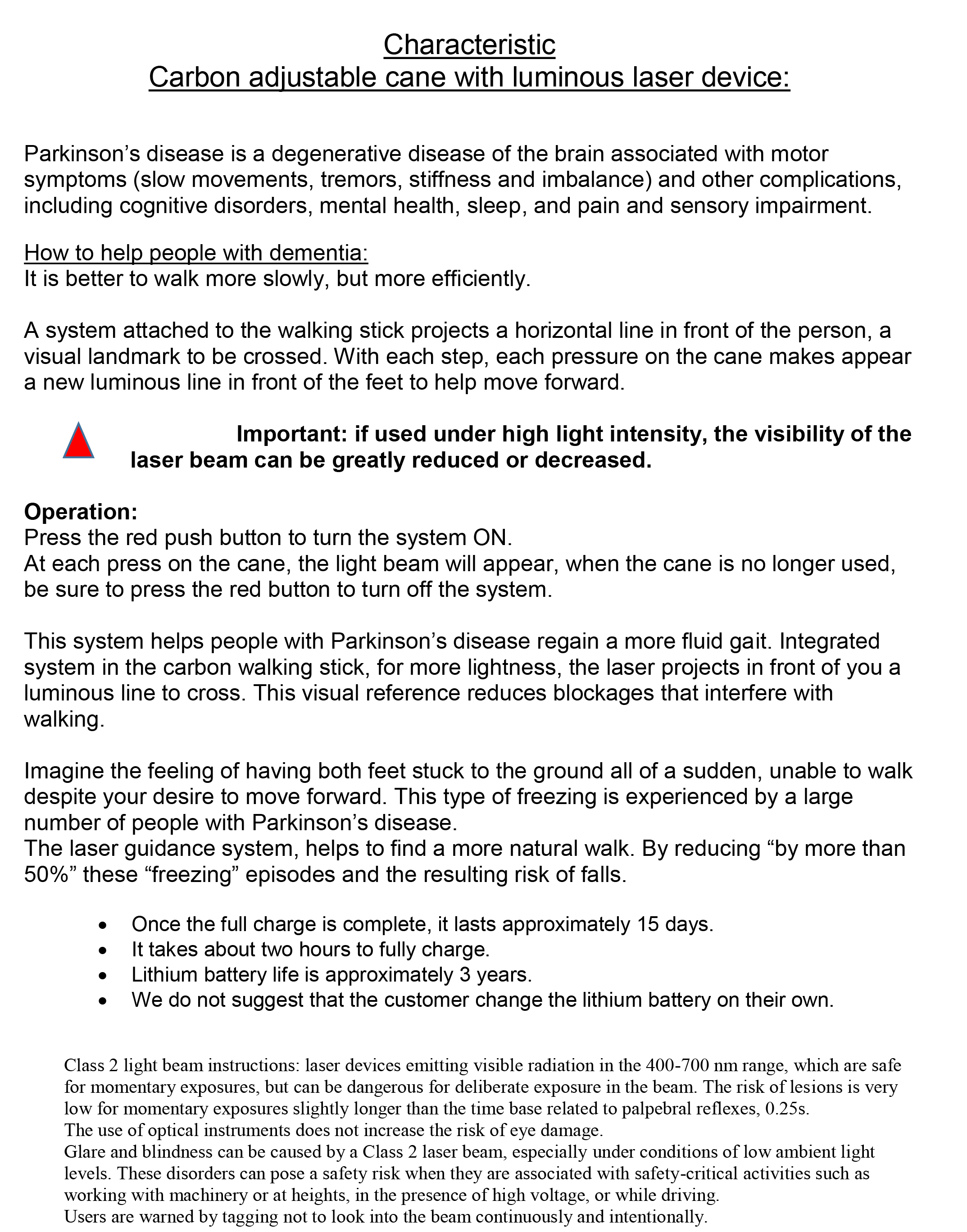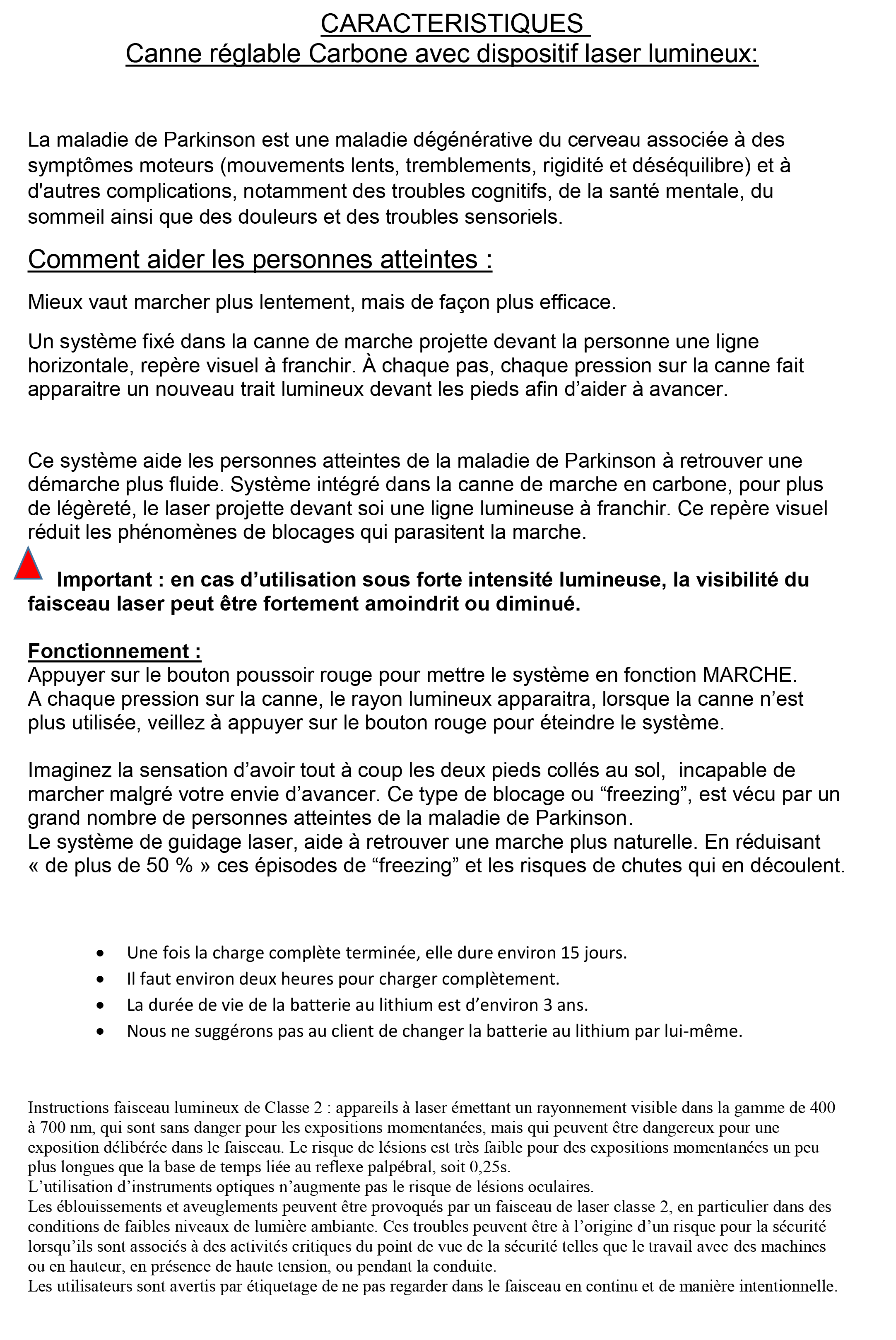 Mieux vaut marcher plus lentement, mais de façon plus efficace. Un système fixé dans la canne de marche projette devant la personne une ligne horizontale, repère visuel à franchir.