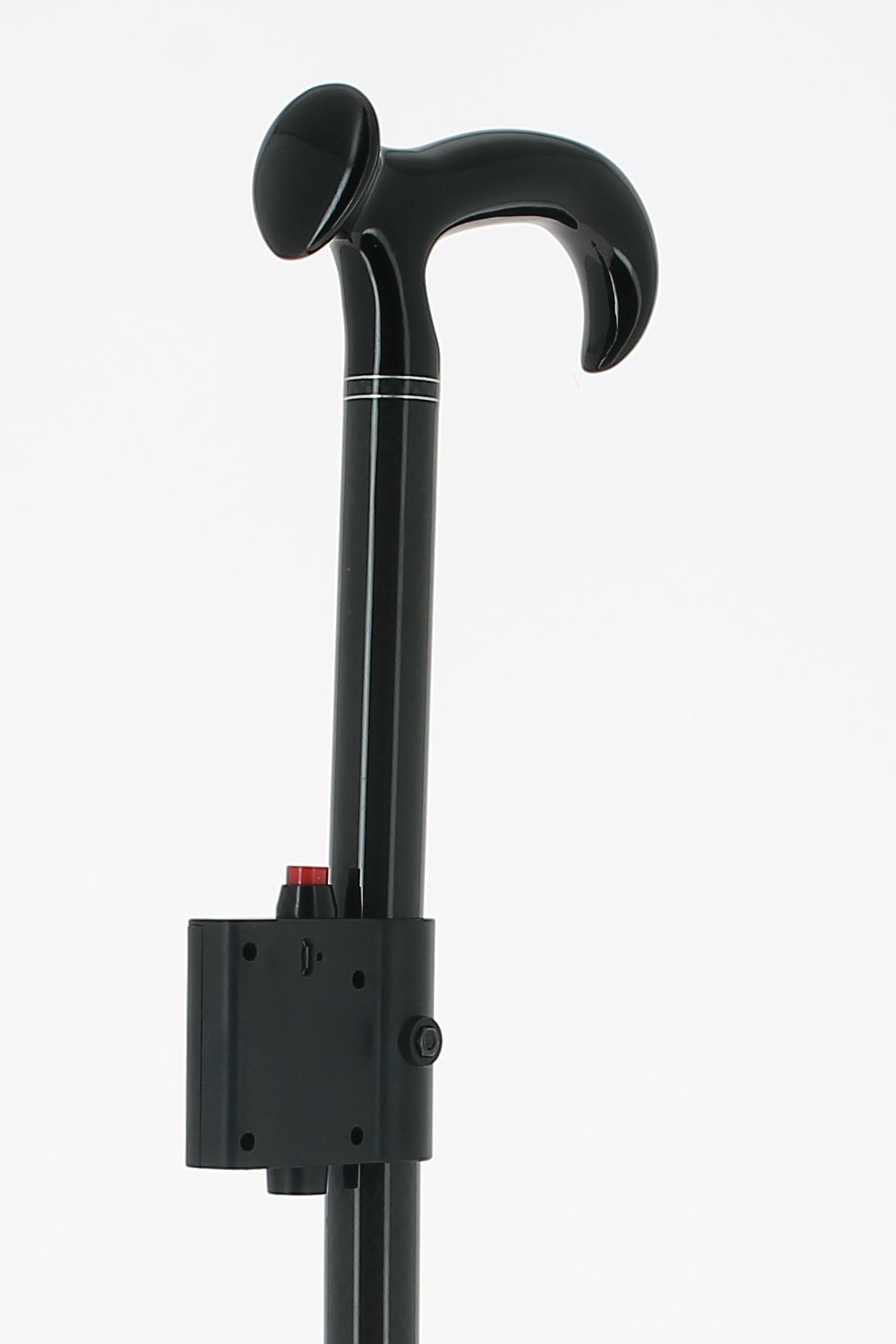 Pommeau milord en plexiglas noir avec une montre incrustée sur bâton en fibre de carbone noir métallisé